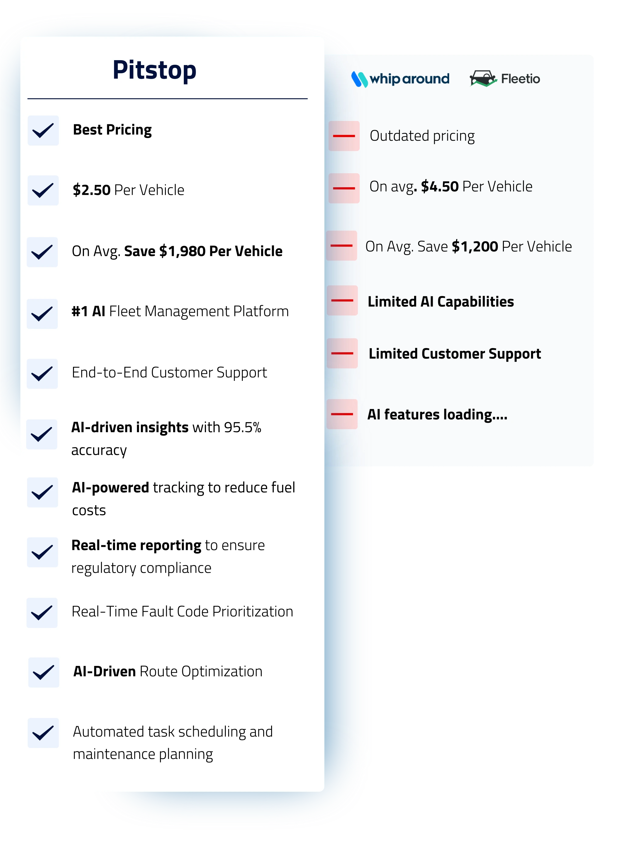 Unlike traditional fleet management platforms that focus only on the basics, Pitstop's AI predicts failures, optimizes performance, and ensures peak efficiency.